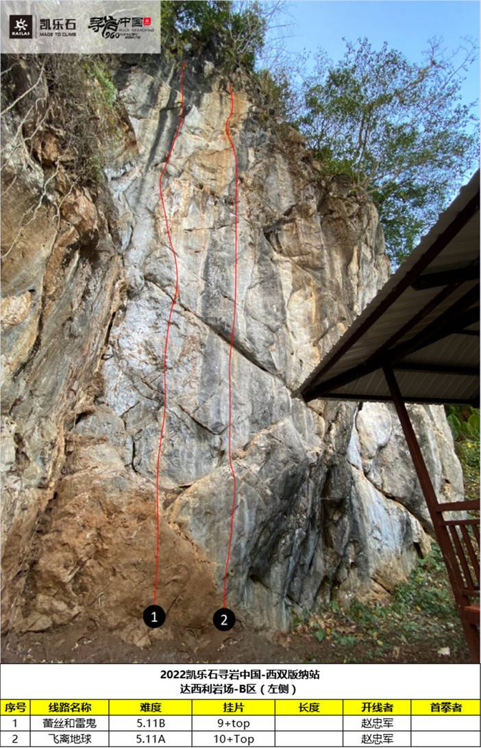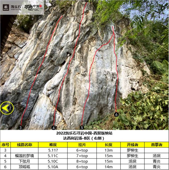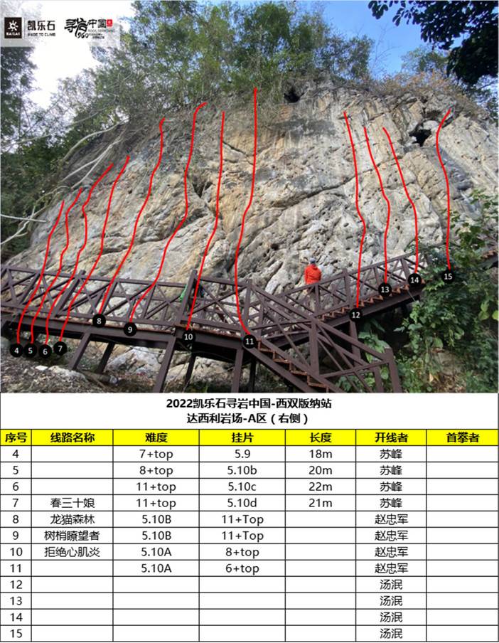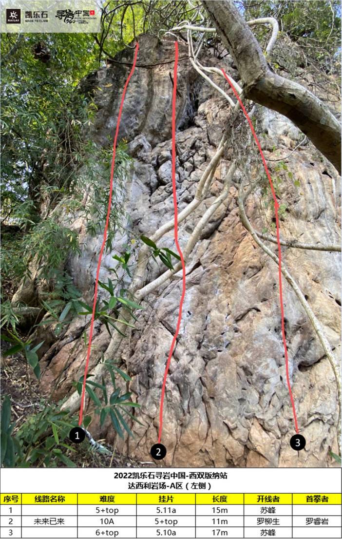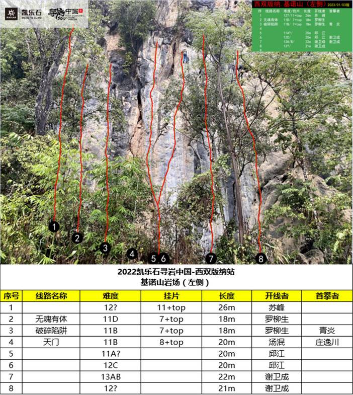 1个岩区,8条风格各异的路线,难度为5.11-5.13,增加了基诺山岩场的路线数量,也补充了路线的难度分布,成为西双版纳州及附近的岩友新人进阶的佳选之一。