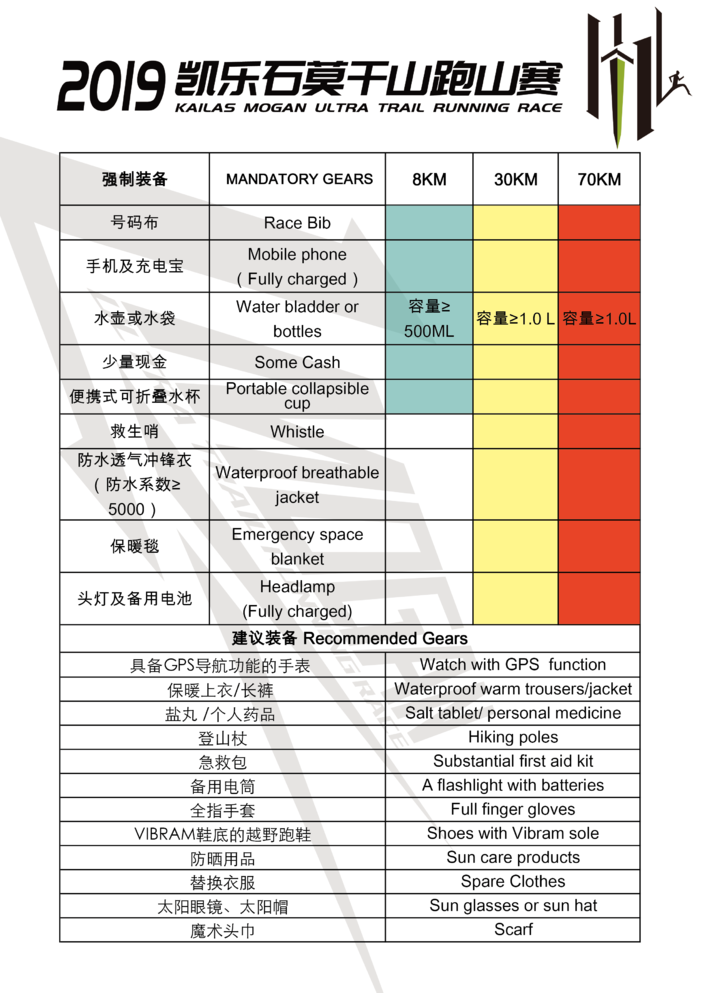 在越野跑赛事中,你将独自面对户外的各种状况,突变的天气、不同的路况、突发的意外。根据赛事组委会的要求携带强制装备,是对越野跑运动的尊重,更是对自己个人安全的负责。安全第一,享受比赛!