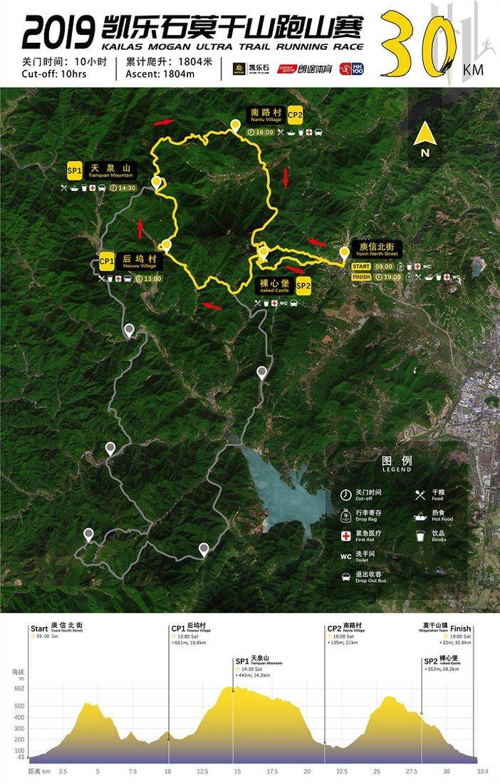 赛道说明:出补给站沿公路1.8KM右前方进入土路,23KM附近横穿马路后右转,注意看路标,沿着小水泥路前进1KM见到水库,不久开始爬2KM到达莫干山庄,在莫干山景区跑3KM到达裸心堡,景区里面游客和岔路口很多,一定要注意看路标,如果20~30米没见到路标,请结合轨迹原路返回找到上一条路标,再观察前进方向。