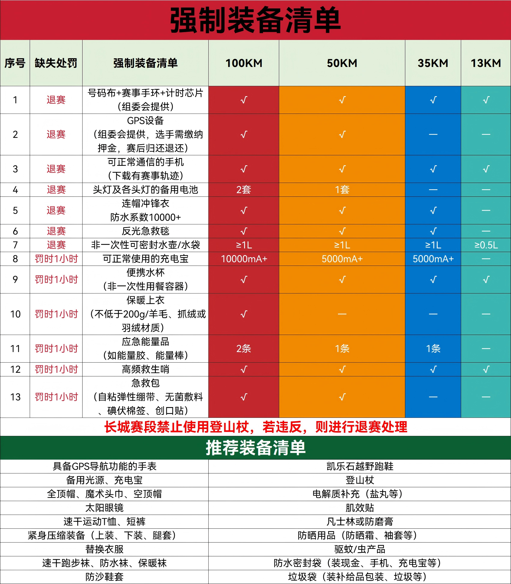 1.因本届赛事跨越时间比较长,早晚温差比较大,考虑安全的因素,组委会将在中途严格进行强制装备检查,若发现参赛者没有按规定备齐强制装备,将会进行罚时处罚或取消参赛者的成绩,并拒绝其继续参赛。
