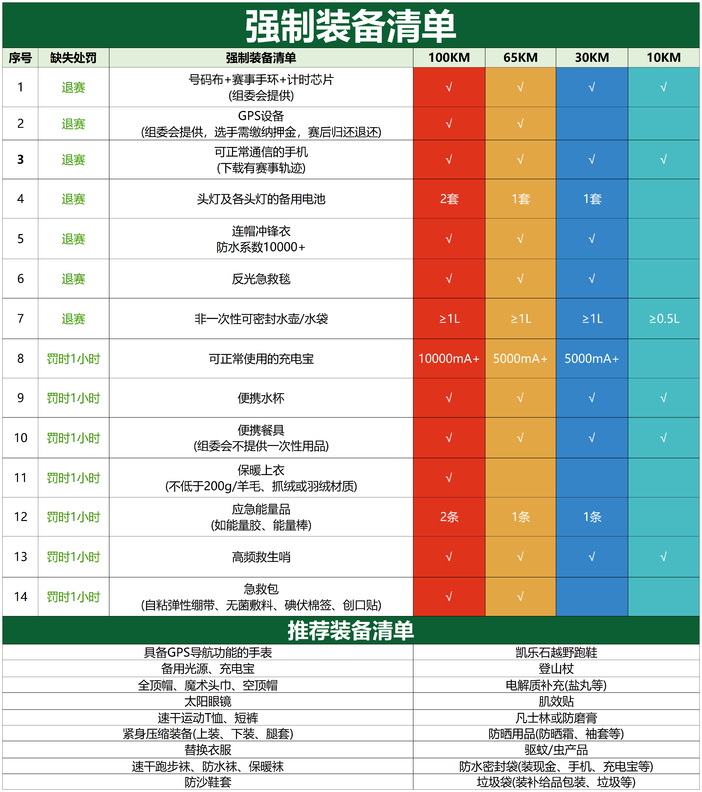1、因本届赛事跨越时间比较长,早晚温差比较大,考虑安全的因素,组委会将在中途严格进行强制装备检查,若发现参赛者没有按规定备齐强制装备,将会进行罚时处罚或取消参赛者的成绩,并拒绝其继续参赛。