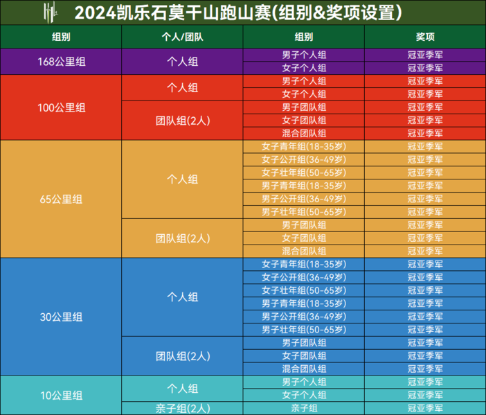 1、10公里/30公里/65公里/100公里组别【个人组】【团队组】【亲子组】及各参赛组别(详见后表)名次奖项均颁发【赛事奖杯及纪念奖品】;