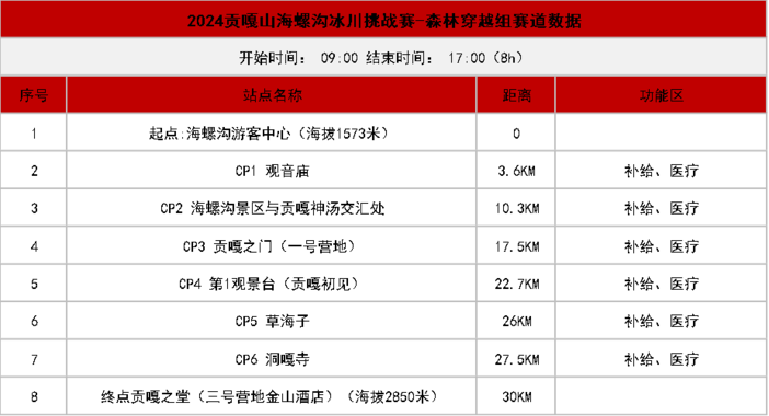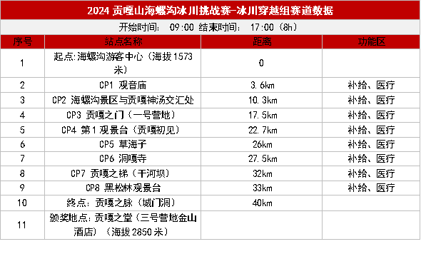 | 09:00-17:00 | 海螺沟景区 | 冰川组/森林组出发,享受赛道的美景 |