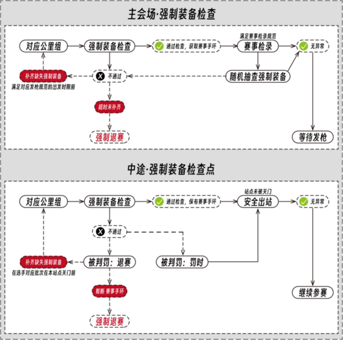 注:在终点裁判会对所有组别冠亚季军选手进行强制装备检查,并作为判定成绩是否有效的依据。缺少强制装备的参赛者将被取消成绩