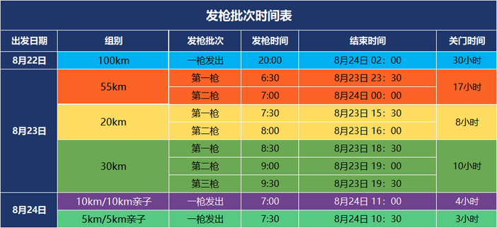 【日期】823日 5:00-8:30(各组别对应领包截止时间为对应组别发枪前15分钟)