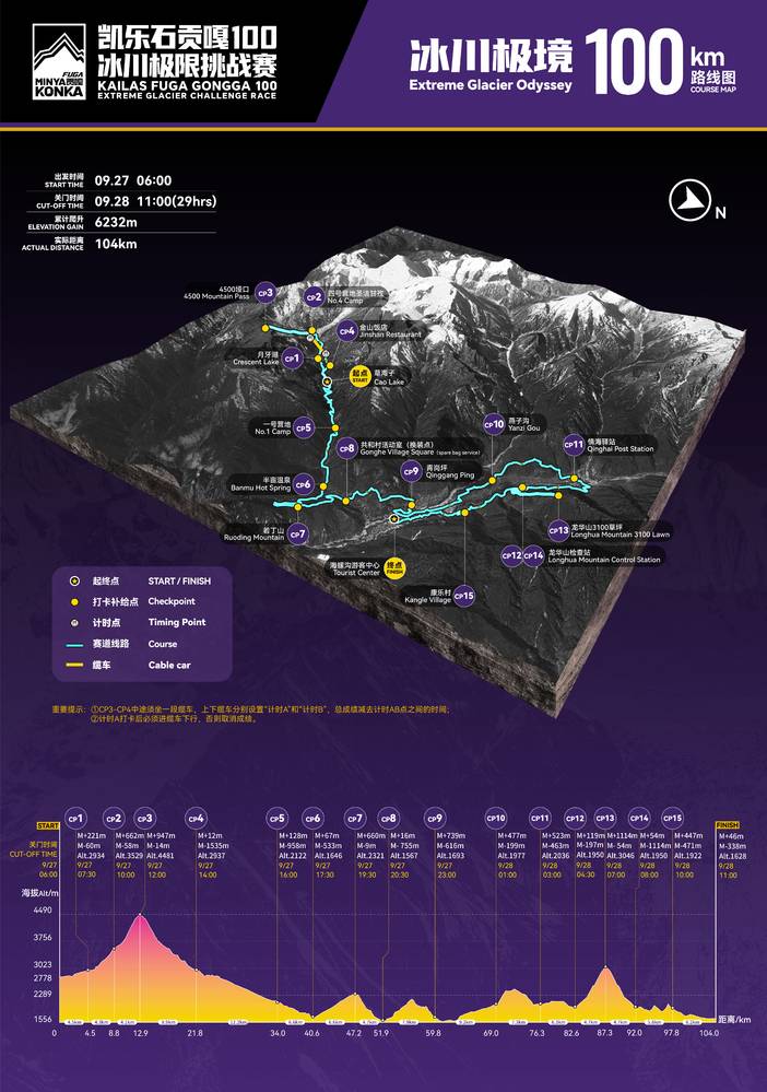 草海子(起点)—蝴蝶王国驿站—冰川雨林—城门洞—越野车赛道--CP1月牙湖—1号冰川—冰川观景区—大冰瀑布—CP2四号营地—红石滩—CP3 4500垭口—红石滩--缆车计时A--缆车--缆车计时B--空中铁网栈道--CP4金山饭店--冰川雨林--草海子--CP5一号营地—铁桥--CP6半亩温泉—CP7若丁山--柏秧坪—CP8共和村活动室(换装点)--共和村--伐竹岗--CP9青岗坪--青岗坪大桥--榆磨路--康藏珍禽保护繁育--CP10燕子沟--高家坪—大坪山—CP11情海驿站—折田坝—大沟—坭马驼—CP12龙华山检查站—CP13龙华山3100草坪—CP14龙华山检查站—柏家山—CP15康乐村--观音古寺--榆磨路--情海路--海螺沟游客中心(终点)