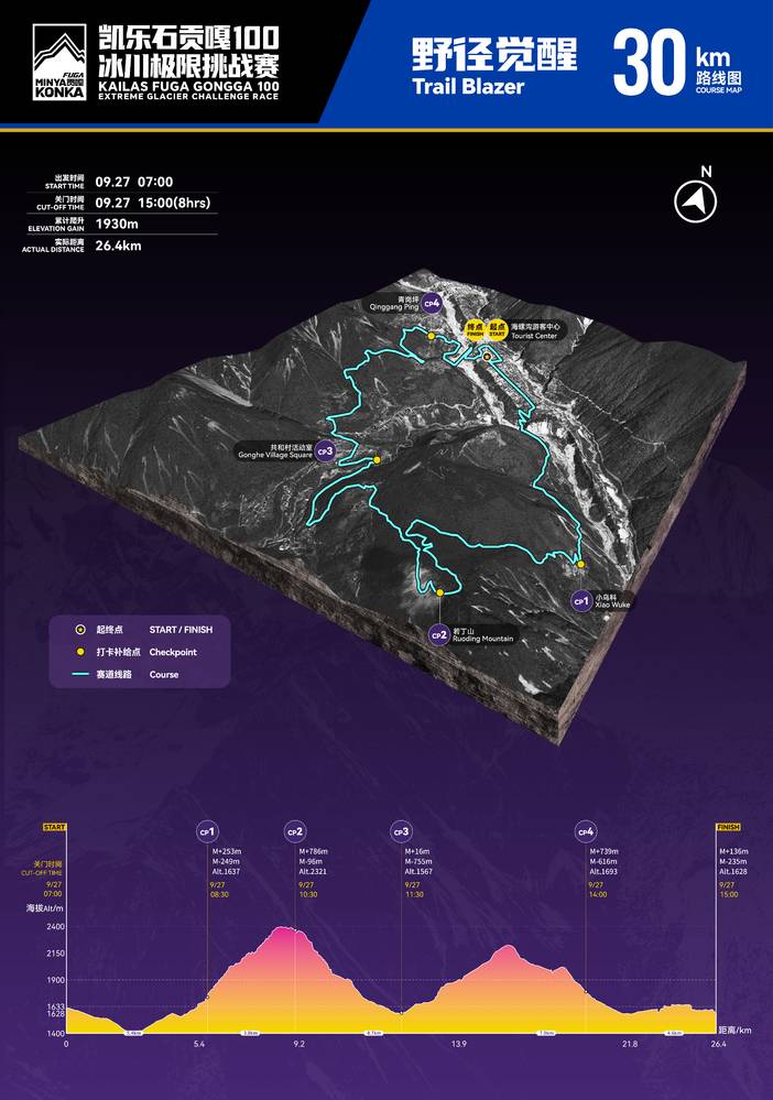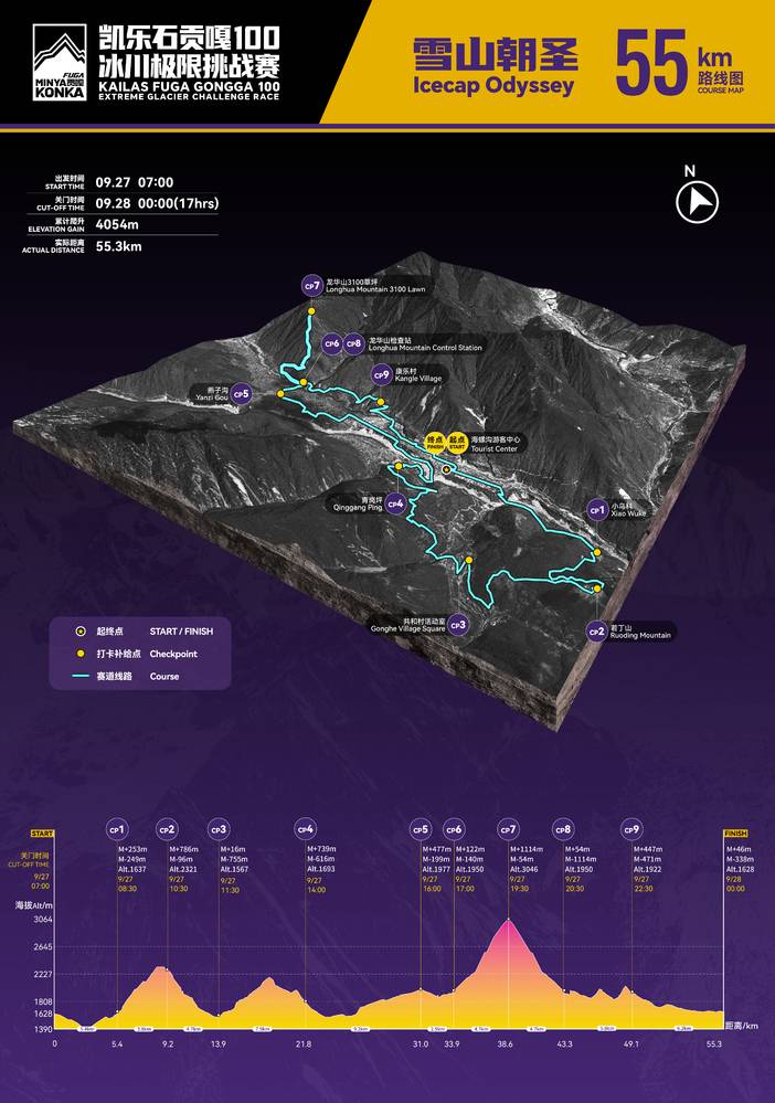海螺沟游客中心(起点)--贡嘎大道中段--CP1小乌科--放牛道--山脊线—CP2若丁山--放牛道--柏秧坪--CP3共和村活动室-共和村--伐竹岗—CP4青岗坪--青岗坪大桥—明珠花园--燕子沟路--情海路--海螺沟游客中心(终点)
