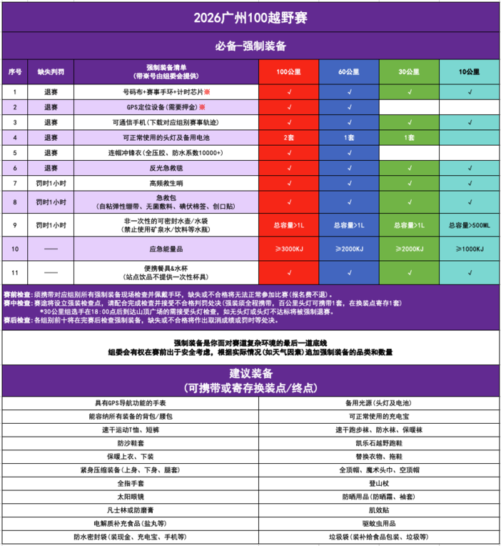 注:在终点裁判会对所有组别冠亚季军选手进行强制装备检查,并作为判定成绩是否有效的依据。缺少强制装备的参赛者将被罚时或取消成绩。