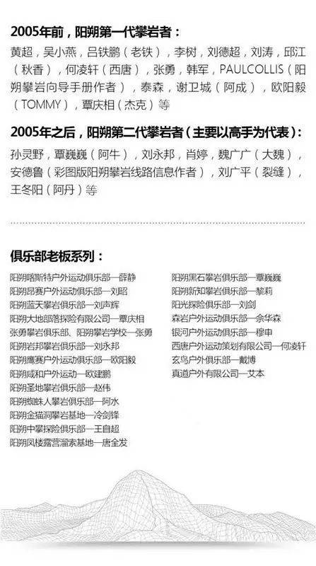 以上名单仅列出阳朔攀岩历史的部分参与者。衷心感谢对阳朔攀岩做出贡献的所有人,一些因分类统计方式造成疏漏的阳朔攀岩开创者及前辈,我们会在之后的【阳朔攀岩历史回顾】的专题中做出详细的介绍。