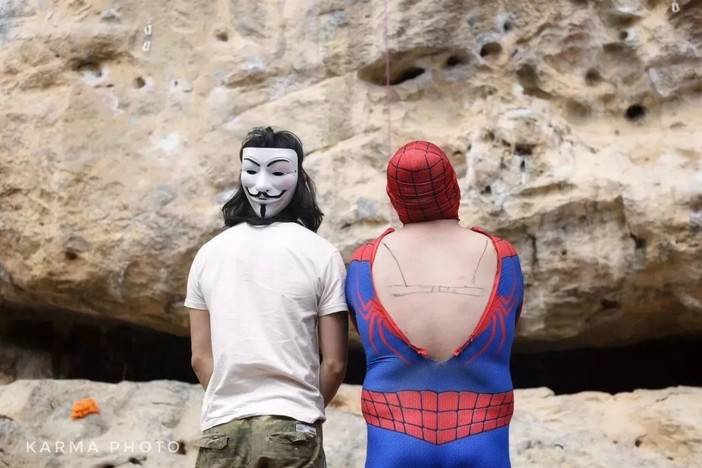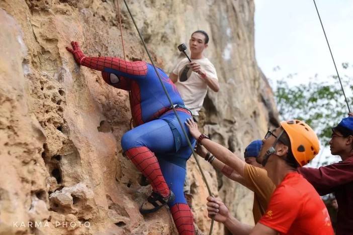 来看看白山主会场吧,得益于「异装攀岩」、「搞怪剧组」和「多爬多得」的激情攀爬参赛选手、新区「跟着大师去开线」课程老师学员、身着红色Kailas盛装的裁判、工作人员,及前来围观的吃瓜群众恶搞激情演绎,整个会场,从主墙高难度社区、右侧中低难度社区到刚刚开辟出来的简单线新区,都充满了「大话西游」的欢乐气氛。