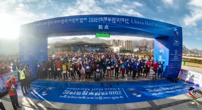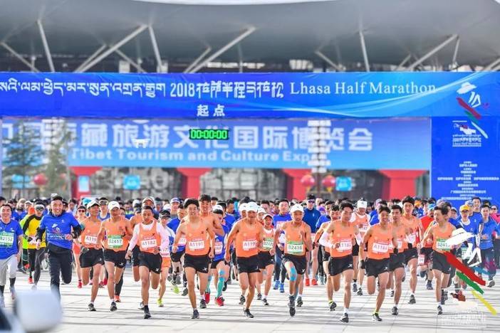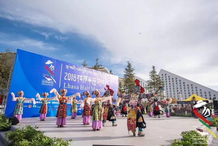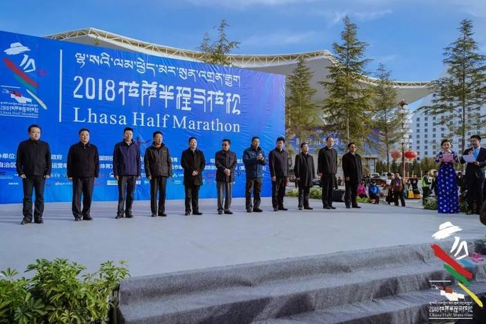 上午十点,开幕式拉开帷幕。富有当地民族特色的蓝面具藏戏开场歌舞《祝福吉祥》揭开了开幕式的精彩序幕,西藏自治区党委常委、拉萨市委书记白玛旺堆,西藏自治区副主席甲热·洛桑丹增, 西藏自治区体育局党组书记刘伯清, 西藏自治区体育局局长尼玛次仁,自治区政府办公厅罗旺次仁,拉萨市委常委、常务副市长占堆,拉萨市委常委、宣传部部长吴亚松,拉萨市委常委、秘书长廖波等领导出席了开赛仪式。拉萨市委常委、常务副市长、2018拉萨半程马拉松常务副主任占堆致欢迎辞,他在发言中热烈欢迎来自各地的跑步爱好者齐聚拉萨。随后,西藏自治区党委常委、拉萨市委书记白玛旺堆,西藏自治区副主席甲热·洛桑丹增为2018拉萨半程马拉松鸣枪开赛。