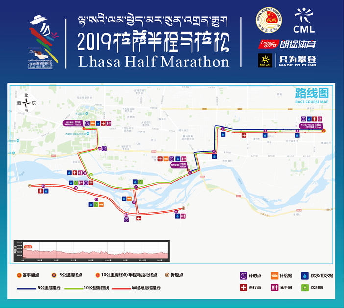 半程马拉松(21.0975公里):洲际酒店(起点)—江苏大道—藏热路南段—藏大西路—江苏东路—拉萨大桥—滨河路—迎亲桥—南环路(三号闸-文成公主路口)—迎亲桥—阳岛路—金珠东路—康昂多南路—北京中路—布达拉宫广场(终点)