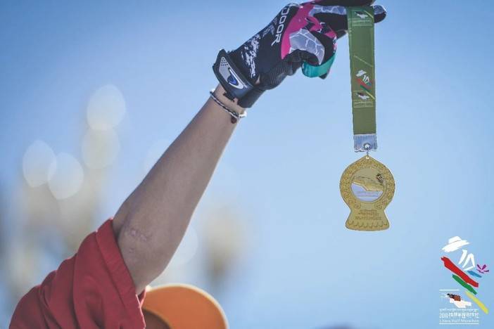 拿到奖牌,不忘和布达拉宫合个影