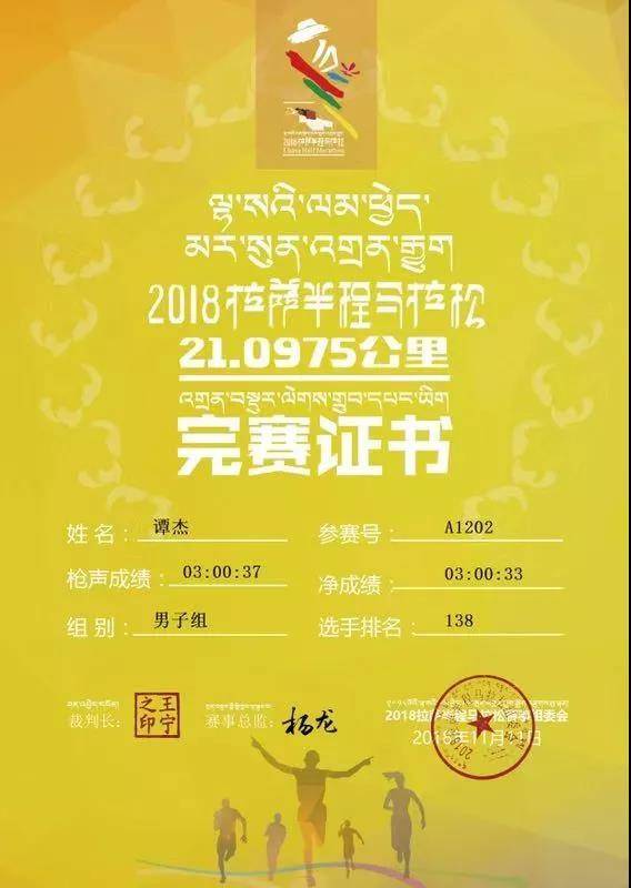 但是,心脏很严肃地开始剧烈跳动,我也很不争气地在布达拉宫的正前方慢下脚步走了起来,加油声不绝于耳,但我实在难以为继,我心里说,对不起,让你们失望了。心率平复到大约150的时候,我开始冲刺,估计是7分半配速吧,通过终点的刹那,我看了一眼计时钟,3小时00分37秒。我用了自己半程马拉松 PB 两倍的时间,完成了拉萨半马。