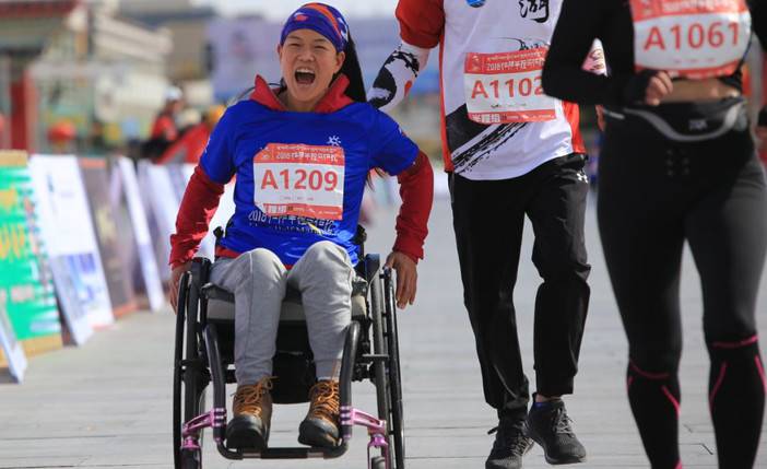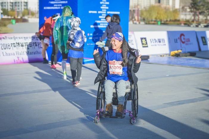蓝天姐摇着轮椅,从众位选手间呼啸而过。好一个“佛挡杀佛”的两岛太后。或许在熙熙攘攘的八廓街,你的速度比她快,但只有在赛道时,她的轮椅会瞬间变成真正的风火轮。她坐在风火轮上,脸上浮现出开心兴奋的笑,好像第一次发现原来这风火轮还有这么大的威力。
