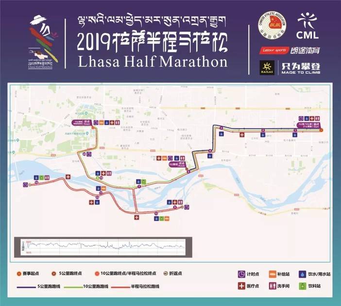 10公里组:洲际酒店(起点)—江苏大道—藏热路南段—藏大西路—江苏东路—拉萨大桥—滨河路—迎亲桥—阳岛路—金珠东路—康昂多南路—北京中路—布达拉宫广场(终点)