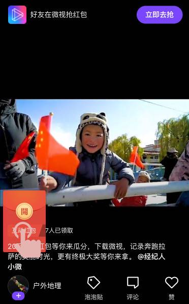 领红包步骤 ➀ :扫描识别下方二维码,观看「户外地理」微视官方账号视频。