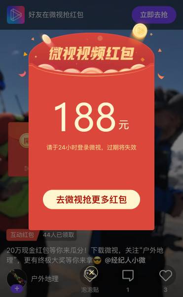 现金红包 20 万!观看视频就能瓜分现金红包,单个红包最高可领 188 元!