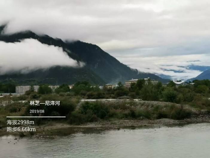 林芝——尼洋河畔,8月12日,海拔2998米,距离6.66km,配速6’11,平均心率159次/分。清晨的高原深深凉意,云层贴地而行,不知是云追我,还是我追云。从山顶下来的凉风带走身体散发的热量,清爽得心旷神怡。这是第一次的试验性跑步,效果尚可,但摄氧的难度增加,几次连续深呼吸胸腔仍是舒缓不够,心率也偏高,看来要加速适应高原气候了。