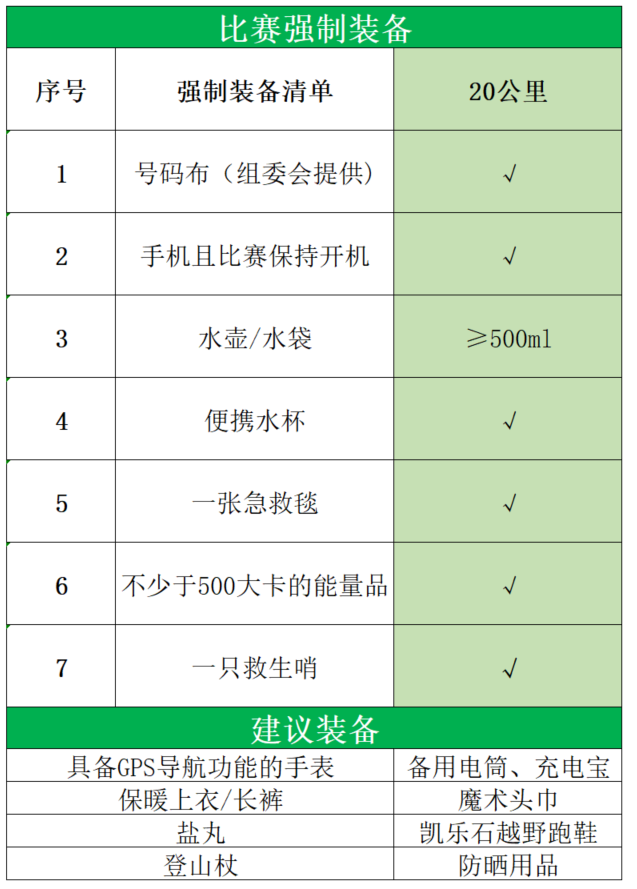 注:手机是组委会与选手在紧急情况下互相通联的保障,也是选手在迷路、确认当下所处位置、查看官方轨迹的有效工具,选手需预估自己手机的耗电情况,随身携带足量的充电宝确保手机全程可用。