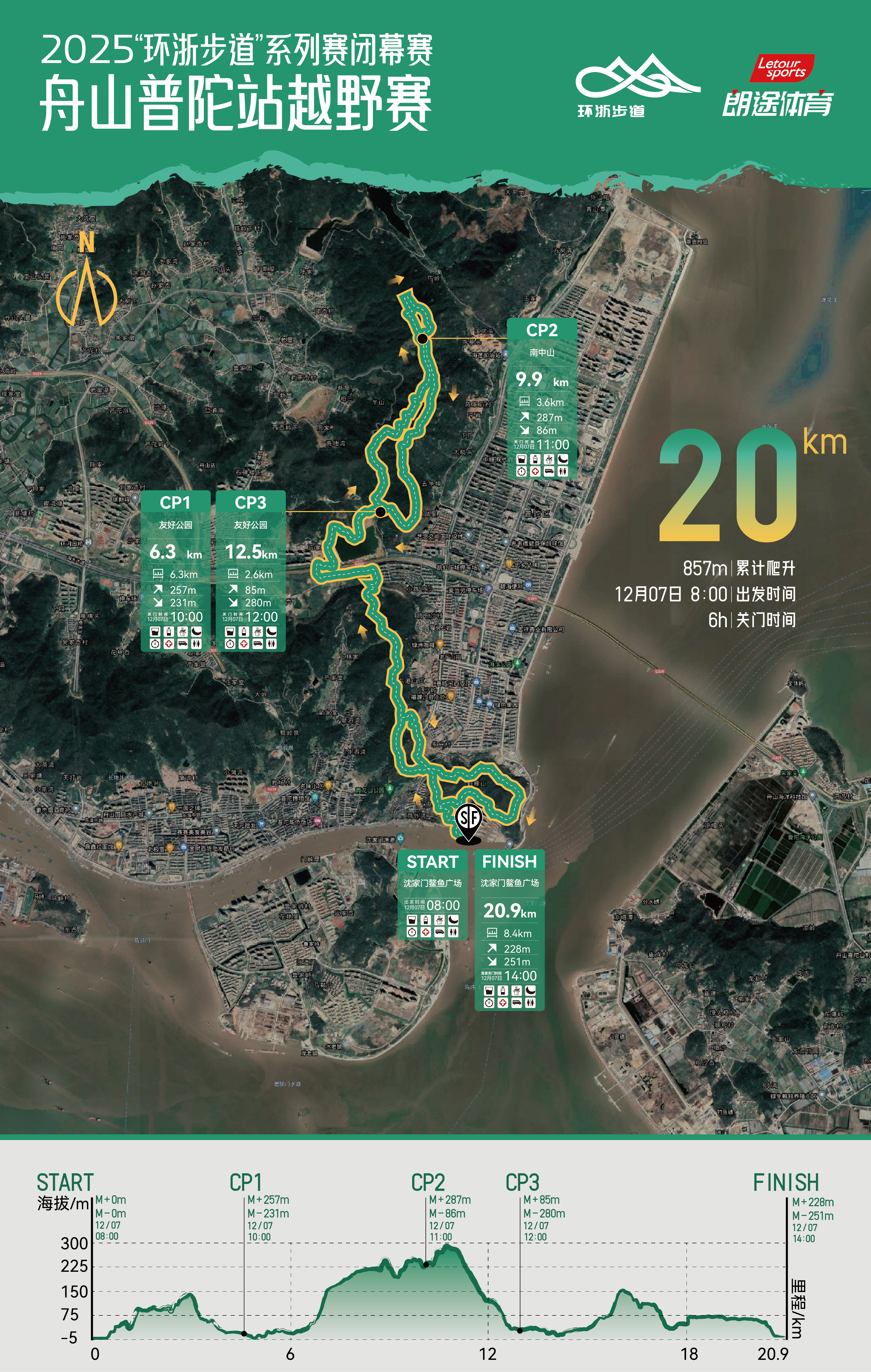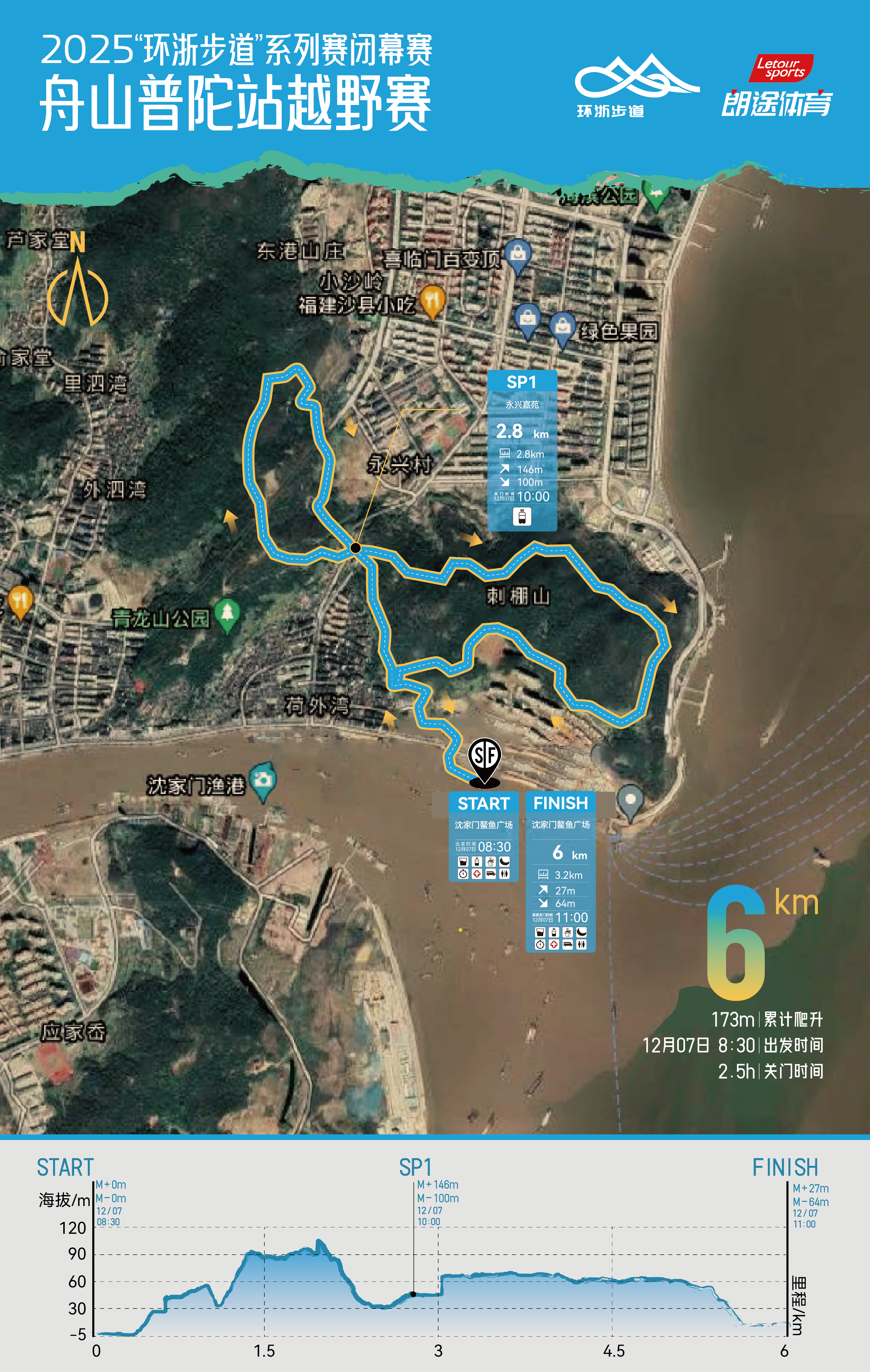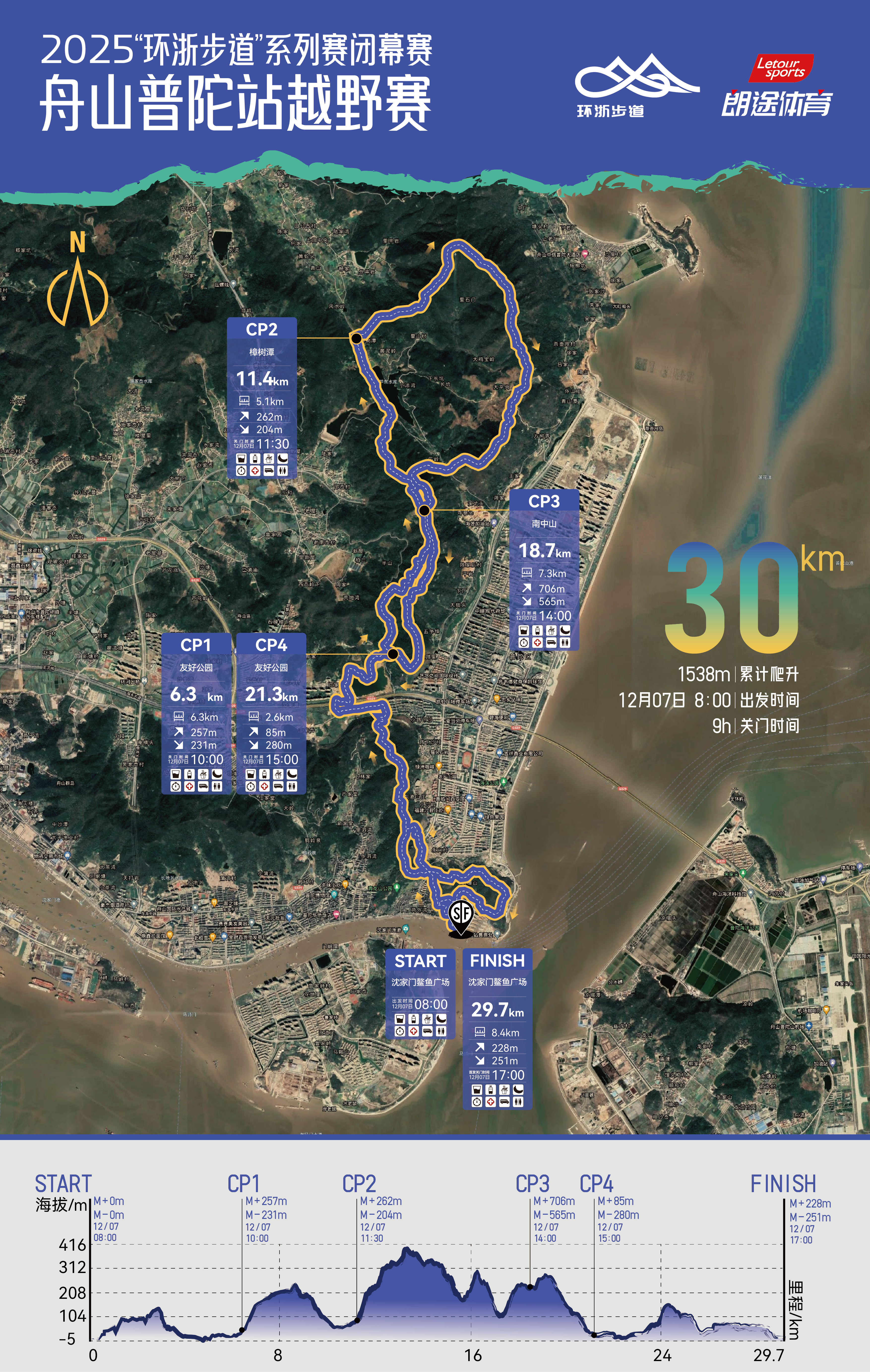 路线详情:沈家门鳌鱼广场(起点)→滨港路→滨港二路→荷外→普陀区气象局→烈士塔→大草坪→大岗→瑞丰家园→海天大道隧道→CP1友好公园→CP2樟树潭→凤尖山→大展湾岗→小龙头岗→武尖山→里山里设计→CP3南中山→CP4友好公园→海天大道隧道→瑞丰家园→大岗→广福寺→刺棚山→荷外→滨港二路→滨港路→沈家门鳌鱼广场(终点)