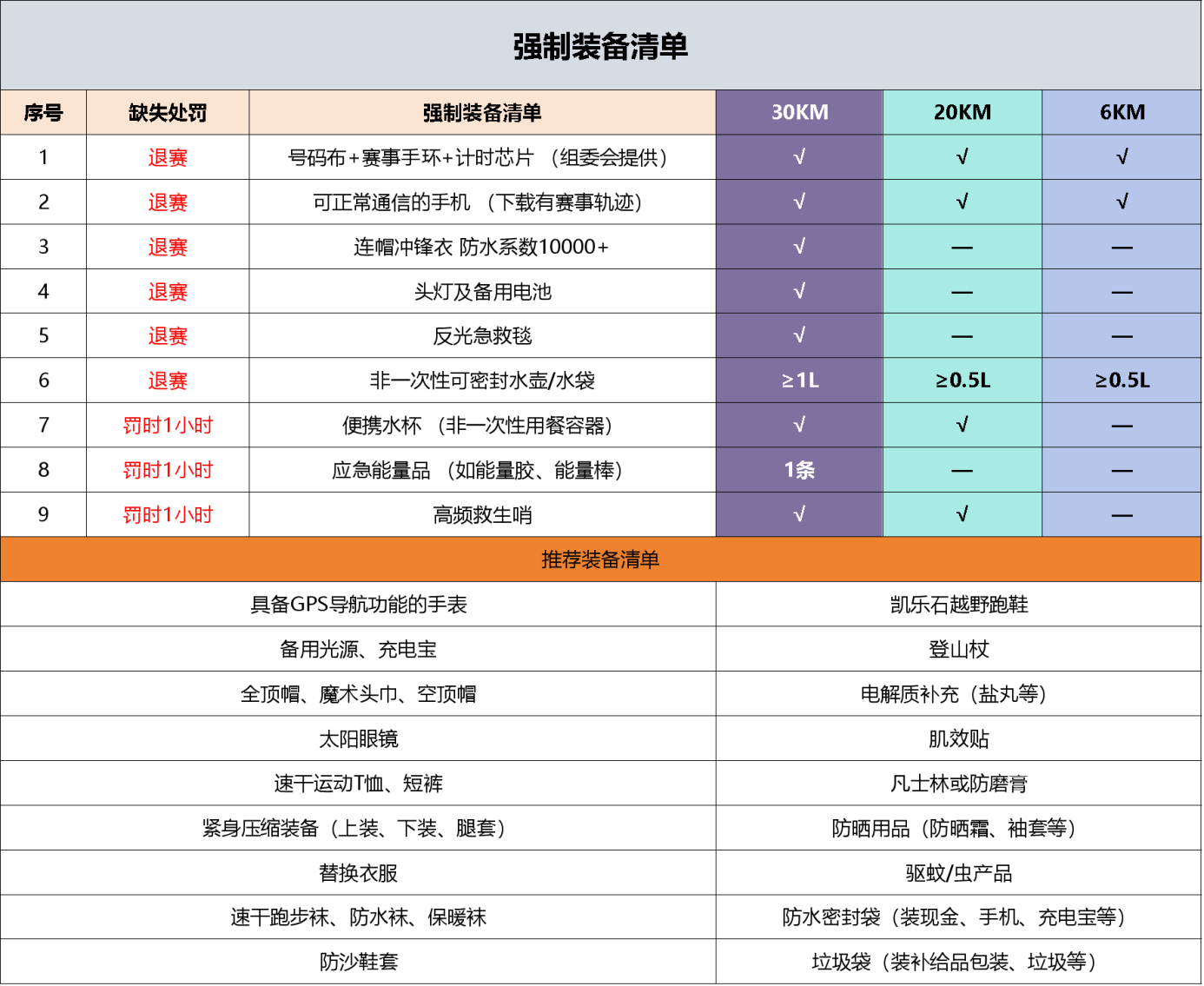 1、因本届赛事跨越时间比较长,早晚温差比较大,考虑安全的因素,组委会将在中途严格进行强制装备检查,若发现参赛者没有按规定备齐强制装备,将会进行罚时处罚或取消参赛者的成绩,并拒绝其继续参赛。