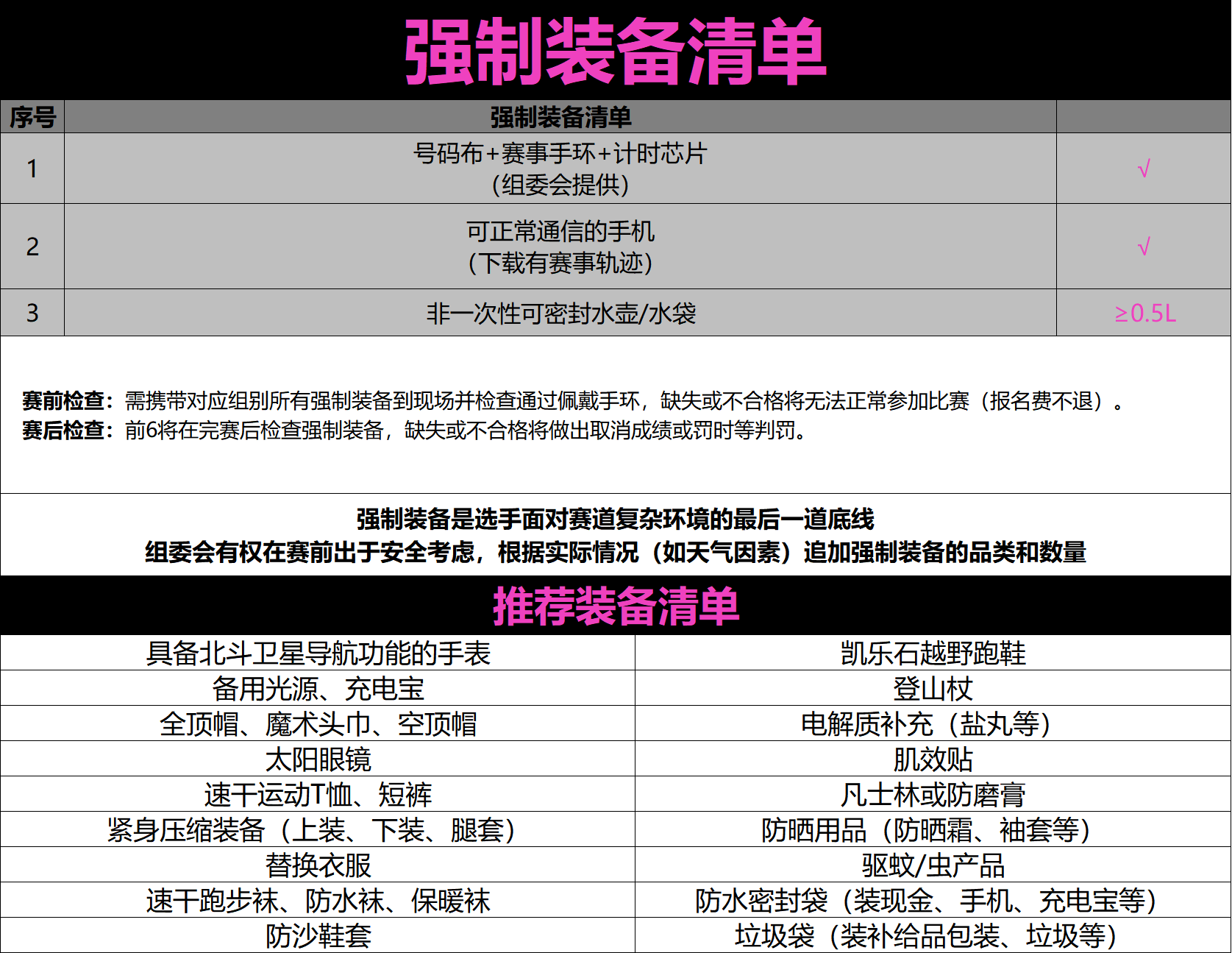 1.因本届赛事跨越时间比较长,早晚温差比较大,考虑安全的因素,组委会将在中途严格进行强制装备检查,若发现参赛者没有按规定备齐强制装备,将会进行罚时处罚或取消参赛者的成绩,并拒绝其继续参赛。